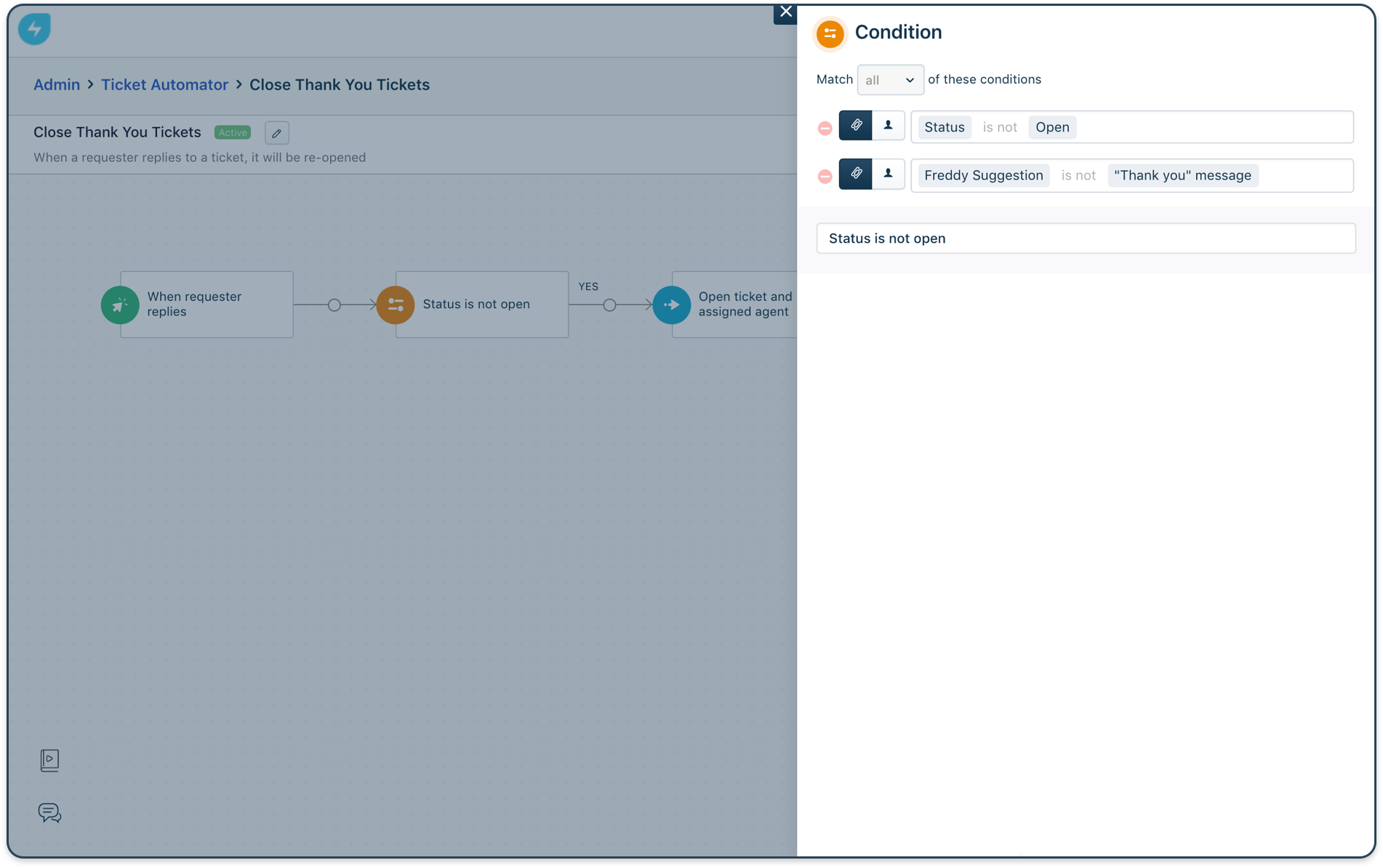 外出消息和通用回复(例如“谢谢”)通常会重新打开工单并弄乱指标。不再是这样了!由 Freddy 提供支持的“感谢检测器”使用 AI 分析对传入票证的响应,并仅重新打开需要进一步帮助的票证。