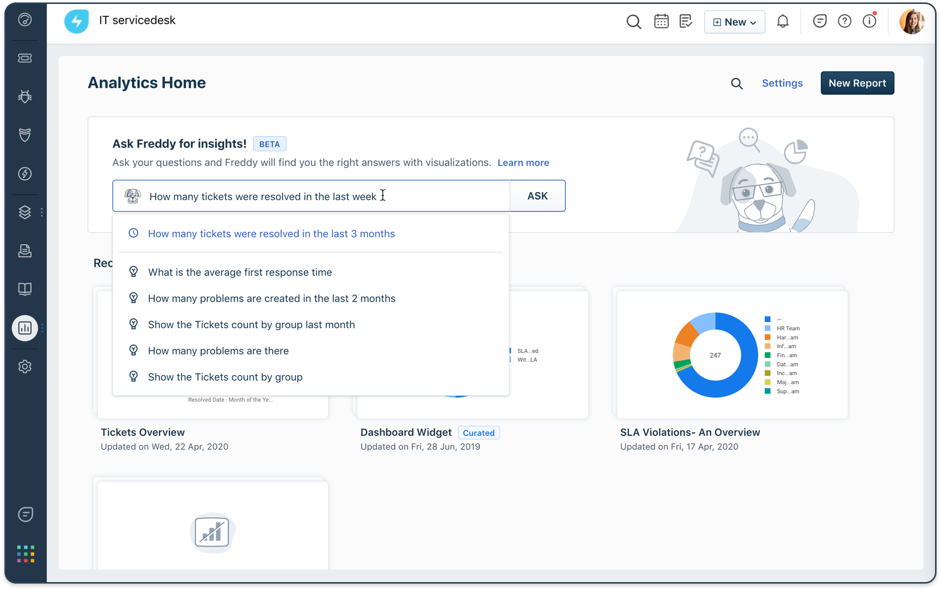 从服务台的大量现有报告中搜索正确的指标总是很乏味。但我们改变了游戏规则。自然语言处理 (NLP) 引擎允许您以简单的英语询问指标,Freddy 将以报告、表格等形式获取它们。